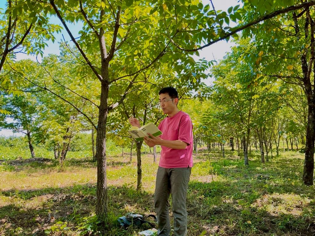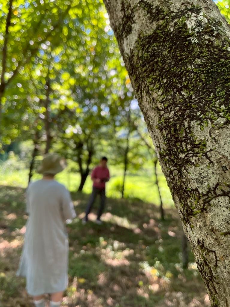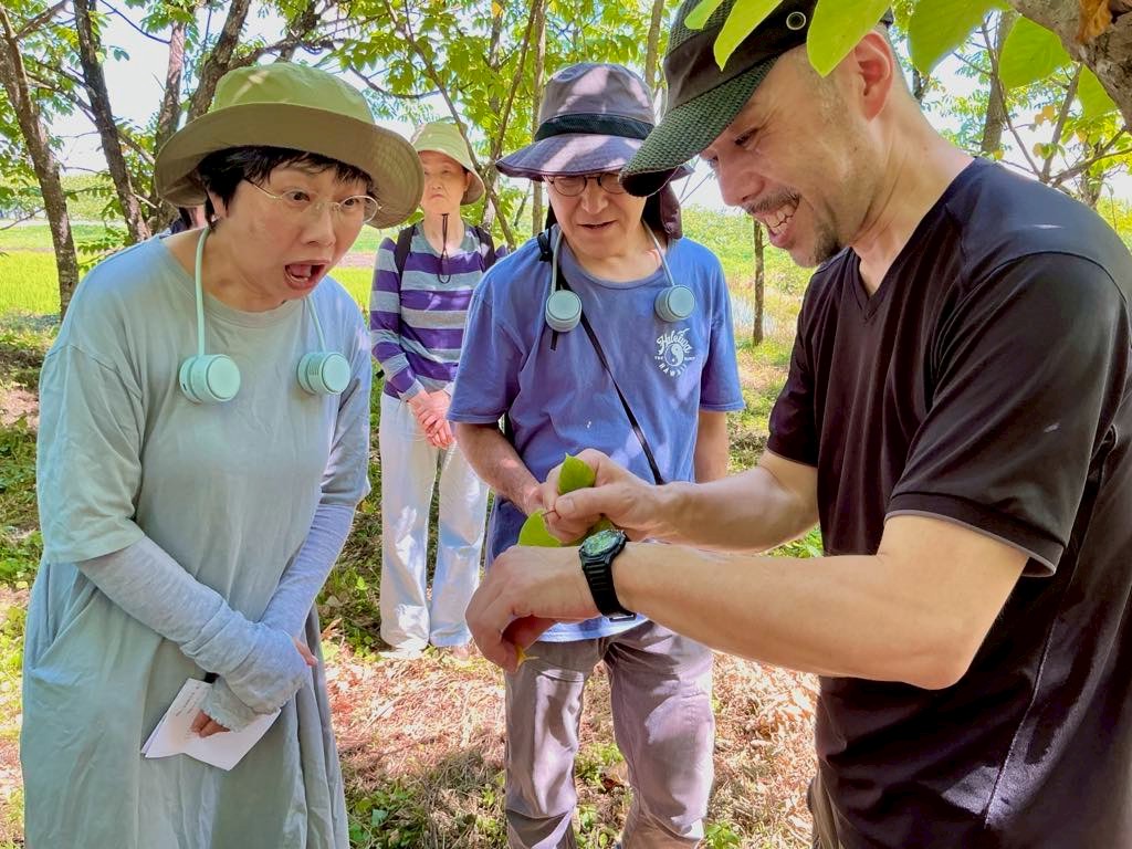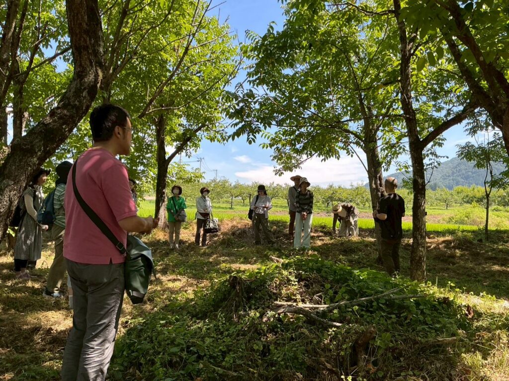 まずは、はるなか漆部会が丹精込めて手入れしている漆樹の植栽地へ。木陰は街中よりは少し過ごしやすく、蝉時雨に包まれていました。